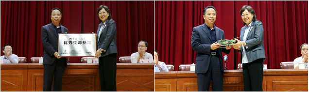 走訪團隊隨后在桃源一中體育館舉行了“北京理工大學優秀生源基地”授牌儀式,栗蘋代表北理工向桃源一中授牌并贈送了學校科研產品模型。