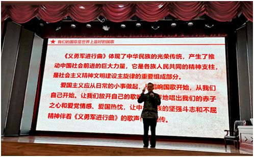 在講座中,于海指導(dǎo)同學(xué)們理解和感悟中華人民共和國(guó)國(guó)歌《義勇軍進(jìn)行曲》激昂向上、鏗鏘有力的藝術(shù)特色,結(jié)合黨領(lǐng)導(dǎo)民族獨(dú)立解放的時(shí)代背景,為同學(xué)們講述了國(guó)歌中的愛國(guó)主義內(nèi)涵,堅(jiān)定同學(xué)們堅(jiān)定跟黨走的理想信念。在講座中,于海分享了香港回歸和利比亞撤僑中的國(guó)歌故事,幫助同學(xué)們充分理解國(guó)歌作為國(guó)家主權(quán)的聲音象征和精神符號(hào)的重要意義。