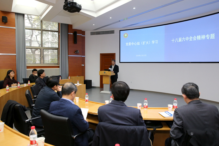 11月17日下午,北京理工大學黨委中心組(擴大)召開專題會議,進一步學習十八屆六中全會精神并作出部署。學校黨委中心組(擴大)成員,各基層黨委、黨總支和直屬黨支部書記,各學院院長,民主黨派負責人,馬克思主義學院教師代表參加了學習。