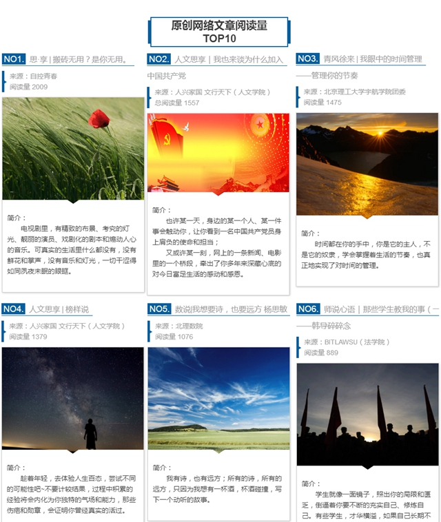 推進(jìn)新媒體品牌欄目建設(shè)。學(xué)生工作處聘請了與學(xué)生工作相關(guān)部門的老師為特約撰稿人,積極撰寫網(wǎng)絡(luò)文章。在學(xué)生工作處微信公眾平臺上,每周推出“佳言就業(yè)”“心理小貼士”“周末安全”等品牌專欄,每月月初公布“北京理工大學(xué)學(xué)工系統(tǒng)原創(chuàng)網(wǎng)絡(luò)文章排行榜”等評比項(xiàng)目,籌備建設(shè)網(wǎng)絡(luò)思政深度報導(dǎo)特色欄目“北理瞭望”,力求打造一批有吸引力、有發(fā)展力、有影響力的新媒體品牌欄目。