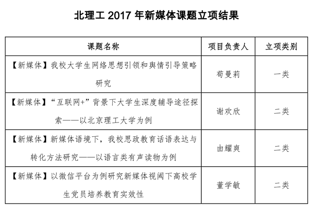 積極開展新媒體思政課題研究,撰寫網(wǎng)絡(luò)思政教育工作論文。2016年9月初,為探索思政教育的有效途徑,拓展渠道,更有效地開展網(wǎng)絡(luò)思想政治教育工作,學(xué)生工作處組織開展課題研究,經(jīng)專家評審、課題交流、反饋修改等環(huán)節(jié),立項(xiàng)了一批新媒體思政研究課題。此外,各學(xué)院積極撰寫網(wǎng)絡(luò)思政教育工作論文,管理與經(jīng)濟(jì)學(xué)院張瑞老師撰寫的論文《新媒體視角下高校網(wǎng)絡(luò)文化育人功能探析——以17所高校微信公眾號為例》,宇航學(xué)院方蕾、魏昕林老師撰寫的論文《對新媒體環(huán)境下高校輔導(dǎo)員思想政治教育話語權(quán)的探究與思考》分獲北理工2016年輔導(dǎo)員學(xué)術(shù)活動月思政論文一等獎、二等獎。