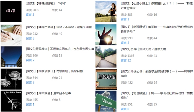 打造網(wǎng)絡(luò)思想政治教育平臺體系。在學(xué)生工作處的指導(dǎo)和規(guī)范下,各學(xué)院積極拓展網(wǎng)絡(luò)平臺,各學(xué)院黨委副書記、輔導(dǎo)員積極參與網(wǎng)絡(luò)文章撰寫。本學(xué)期截至12月初,學(xué)生工作處和各學(xué)院在校院兩級共23個微信公眾平臺上開設(shè)“青風(fēng)徐來”“思·享”“生命之聲”“師說心語”“人文思享”等思政類原創(chuàng)網(wǎng)文板塊近50個,撰寫原創(chuàng)網(wǎng)絡(luò)文章累計超過200篇,閱讀量達(dá)17萬次。其中生命學(xué)院黨委副書記劉曉俏、數(shù)學(xué)與統(tǒng)計學(xué)院黨委副書記馬曉寧、人文與社會科學(xué)學(xué)院黨委副書記李冰、法學(xué)院黨委副書記張愛秀等教師均參與網(wǎng)絡(luò)文章撰寫。