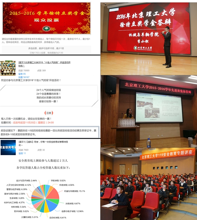 推動思想政治教育活動線下線上相結(jié)合。學(xué)生工作處在傳統(tǒng)的“優(yōu)秀班集體評選”活動中加入“十佳人氣班級”網(wǎng)絡(luò)評選環(huán)節(jié);在“徐特立獎學(xué)金答辯”活動中加入人物風(fēng)采網(wǎng)絡(luò)宣傳及現(xiàn)場網(wǎng)絡(luò)投票環(huán)節(jié);在今年的安全教育環(huán)節(jié)中,學(xué)生工作處在傳統(tǒng)的安全講座的基礎(chǔ)上,面向全體在校生開展了安全教育在線考試,試題涵蓋學(xué)生學(xué)習(xí)、生活相關(guān)的多方面安全知識,一周內(nèi)參與考試人數(shù)超過2萬人,全校學(xué)生參與率90%以上,取得了良好的安全教育效果。