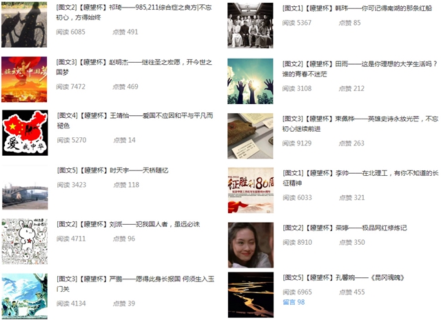 開展“瞭望杯”優(yōu)秀網(wǎng)絡(luò)文章大賽。2016年10月,學(xué)生工作處面向全校師生舉辦了“瞭望杯”2016年第1期優(yōu)秀網(wǎng)絡(luò)文章大賽。比賽涵蓋理想信念教育、愛國主義教育、思想道德建設(shè)等9個主題。收錄網(wǎng)絡(luò)文章共計400余篇,文字累積超過60萬字。在學(xué)生工作處微信公眾平臺推送的部分優(yōu)秀作品,閱讀量累計近15萬次。目前2016年第2期“瞭望杯”比賽正在進(jìn)行中。