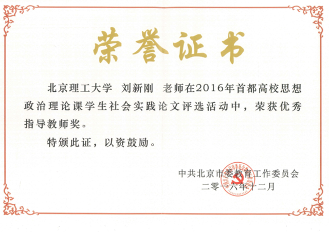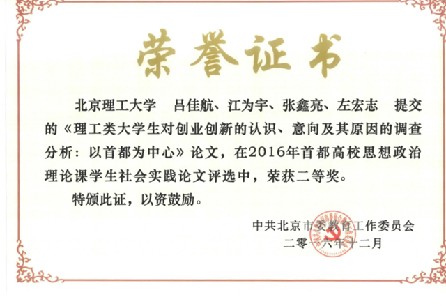 本次活動共收到33所高校提交的157篇學生社會實踐論文,經專家評審,北理工劉新剛老師指導,周暉明、郝卓男、張碧海、譚致、馬少華等撰寫的《大都市電動汽車推廣現狀、問題及對策研究——以北京市為例》論文獲得特等獎(共評出7名特等獎);王娟老師指導,呂佳航、江為宇、張鑫亮、左宏志撰寫的《理工類大學生對創業創新的認識、意向及其原因的調查分析:以首都為中心》論文獲得二等獎,劉新剛獲優秀指導教師獎,北理工榮獲優秀組織獎。北京市教工委專門組織了優秀論文表彰及經驗交流會。