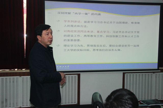 為了讓大家對“兩學一做”內涵有更深刻認識,陳杰副校長用兩個微視頻《習近平用典--為政之要》和《習近平用典---圖難于其易》,生動講解了習總書記關于領導干部治國理政、修身做事的論述。隨后,陳杰副校長帶領大家學習了習近平總書記近期在全國高校思想政治工作會議,全國科技創新大會及知識分子、勞動模范、青年代表座談會上的系列講話。陳杰副校長強調,習近平總書記關于全國高校思想政治工作的重要講話為高校培養什么樣的人、如何培養人以及為誰培養人指明了方向,辦好高校、辦出世界一流大學,必須牢牢抓住全面提高人才培養能力這個核心點,并以此來帶動高校其他工作。科技興則民族興,科技強則國家強,創新始終是一個國家、一個民族發展的重要力量,也始終是推動人類社會進步的重要力量。廣大黨員要深刻理解掌握這些講話的豐富內涵和核心要義,用以武裝頭腦,指導實踐,推動工作。
