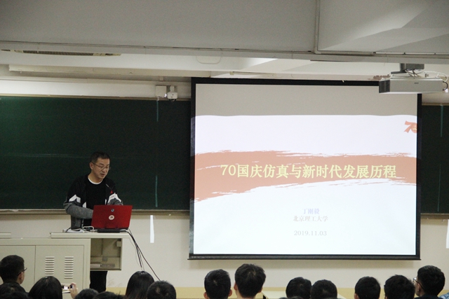 丁剛毅首先介紹了數字仿真團隊在70周年國慶盛典中所承擔的工作并簡單介紹了70周年國慶群眾游行仿真、聯歡活動仿真、電視轉播機位仿真、觀禮人員集結疏散仿真等模塊的多項相關任務,展示了數字仿真團隊如何為70周年國慶慶典提供數據建模和仿真支持。他提到,原本的數字仿真技術并未運用到服務國家重大戰略需求之中,但一年年的拼搏,從2008奧運、60周年國慶盛典到93閱兵、冬奧8分鐘直至剛剛過去的70周年國慶,北京理工大學計算機學院數字表演與仿真實驗室已經慢慢將這種服務看成了我們應盡的責任。這不簡單只是一份工作,這是回答新時代的高校人如何以“智”報國這一問題上我們實驗室給出的答案。之后,丁剛毅通過介紹70周年國慶慶典中的“致敬”“創新驅動”“民族團結”“立德樹人”“不忘初心”等群眾游行方陣的主題、表現形式、構成要素,讓在場同志在近距離感受到中華民族偉大復興的歷史征程的同時,也明確了新時代建設祖國的重任,已經落到了當代青年尤其是學生黨員的肩上。最后,丁剛毅通過播放70周年國慶聯歡活動、群眾游行仿真視頻并講解,讓在場同志更直觀、深入地感受到數字仿真團隊在70周年國慶慶典各項任務中做出的杰出貢獻,他鼓勵黨員們要積極發揮先鋒模范帶頭作用,不僅僅把愛國放在心里,還要落實到行動中去,不要認為愛國離自己太遙遠,要在抓好專業學習的基礎上提升理論學習水平,努力將自己培養成為“又紅又專”的新時代人才。
