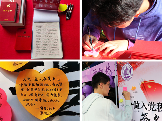 在2020級本科生入學報到日,在睿信書院“爭做2020級首批入黨積極分子”簽名墻上,一張張心形小紙條拼成了黨徽的形狀,紙條上寫滿了同學們對于加入中國共產黨的向往和對于未來報效祖國、服務人民的情懷。