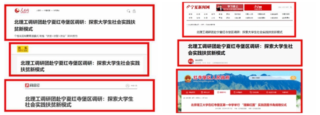 2020年10月,人民網、今日頭條、新浪微博、搜狐、網易號、紅寺堡視線、紅寺堡區人民政府網站、寧夏新聞網等多家媒體紛紛以《北理工調研團赴寧夏紅寺堡區調研:探索大學生社會扶貧新模式》《大學生如何扶貧?北理工調研團在寧夏紅寺堡區找到答案》等為題報道北京理工大學材料學院與寧夏紅寺堡第一中學的共建活動,寧夏日報、吳忠日報、紅寺堡電視臺對活動進行了全程跟蹤報道。此次共建共學主題團日活動是北理工“理展紅圖”社會實踐團赴寧夏紅寺堡開展動態扶貧調研并長期扶貧工作的成果。