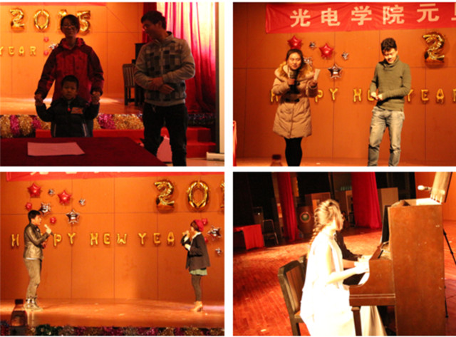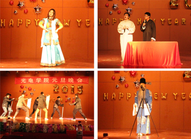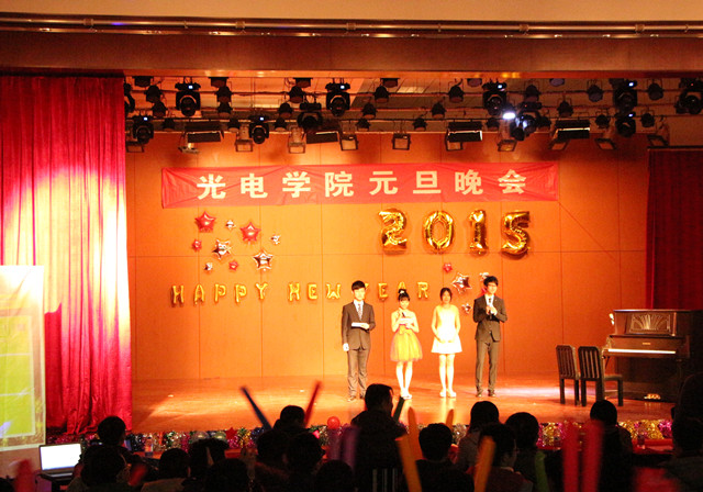 流光溢彩,辭舊迎新。12月31日,光電學院2015年元旦晚會在新食堂四層文化藝術劇場精彩上演。學院師生們齊聚一堂,在歡聲笑語中共同迎接新年的到來。歡快的音樂,溫馨的話語,老師們的祝福,同學們的祈盼,一段幽默詼諧的開場視頻拉開晚會序幕。學院黨委書記郝群致辭,向老師和同學們送上了新年祝福。