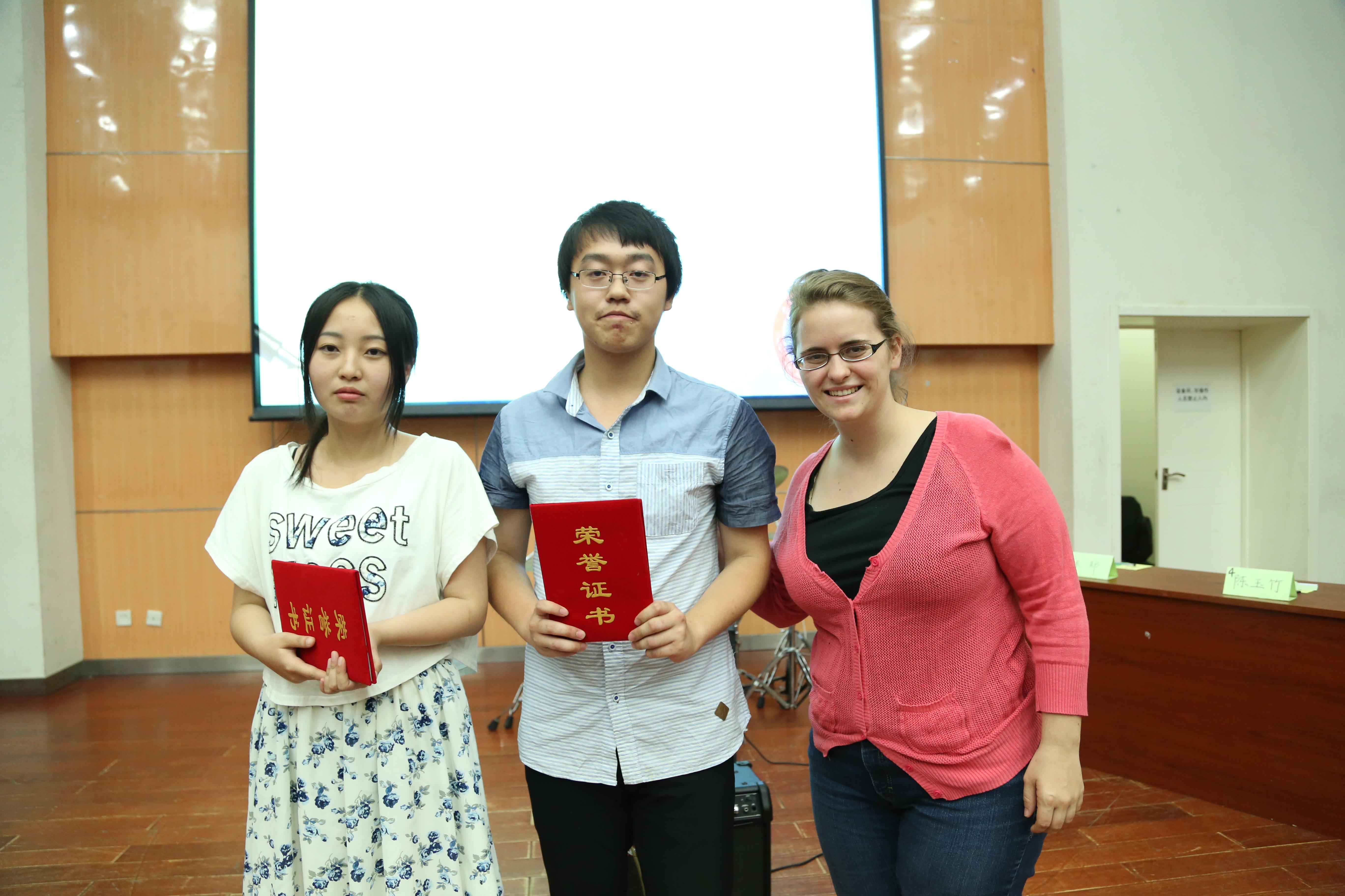 最終,陳玉竹、張鄭和陸天和同學獲得了三等獎,黎瓊、孫航同學獲得二等獎,何鑫同學榮獲本次大賽一等獎,評委們?yōu)樗麄冾C發(fā)了證書。