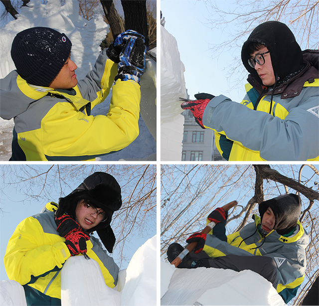 1月4日上午,大賽進入正式比賽階段。比賽中,雪雕隊員夜以繼日的奮戰在雪雕大賽最前線,將全部精力集中于作品的創作之中,每天工作時間超過10個小時。1月6日,比賽進入攻堅階段,隊員們在零下20多度的嚴寒中,克服生理、心理雙重挑戰,徹夜奮戰至次日凌晨4點,經過近20小時的奮戰,雪雕作品順利完成。