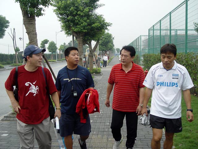 我隊7號球員李爽(左二)的親友團到現場加油助威并與總教練金志揚合影留念。