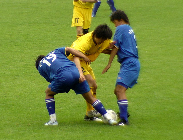 比賽一開始,北理就擺開了一副強(qiáng)攻的架勢,絲毫沒有顧慮這是客場作戰(zhàn),多次在人大門前形成威脅。而人大只能依靠僅有的幾次反擊機(jī)會(huì)來爭取破門,場面比較被動(dòng)。第7分鐘,北理在對方禁區(qū)前沿的一腳怒射劃門而出,這是雙方開場以來的第一腳射門。第15分鐘時(shí),人大形成反擊,幾名隊(duì)員在對方禁區(qū)邊緣幾次漂亮的倒腳引來主場球迷的一陣歡呼,只可惜沒有形成攻門。18分鐘,北理10號(hào)宋飛的半高球斜傳禁區(qū),可惜接應(yīng)隊(duì)員在補(bǔ)防后衛(wèi)的干擾下沒有頂?shù)角颉4撕笠欢螘r(shí)間里比賽主要都是在人大一側(cè)場地進(jìn)行,但北理并沒有制造出很好的破門機(jī)會(huì)。直到第28分鐘,北理7號(hào)李爽斜長傳吊入禁區(qū),可惜隊(duì)友在擺脫對方盯防后未能在門將出擊前拿到球,不過這個(gè)球還是讓所有的主場球迷驚出了一身冷汗。30分鐘,北理11號(hào)王強(qiáng)帶球連續(xù)晃動(dòng)殺入禁區(qū),人大門將李鵬又一次及時(shí)出擊把球得到。上半場行將結(jié)束時(shí),人大利用快速反擊給北理造成了不少麻煩。38分鐘,人大兩名球員做了一次非常巧妙的二過一配合,遺憾的是中路包抄的球員頭球略微高出球門,這也是人大開場以來最具威脅的一次攻門。兩分種之后,人大再一次殺向北理的球門,9號(hào)楊楠接隊(duì)友傳中凌空打門偏出,浪費(fèi)了一次機(jī)會(huì)。不久,上半場比賽結(jié)束,雙方0:0暫時(shí)打平。