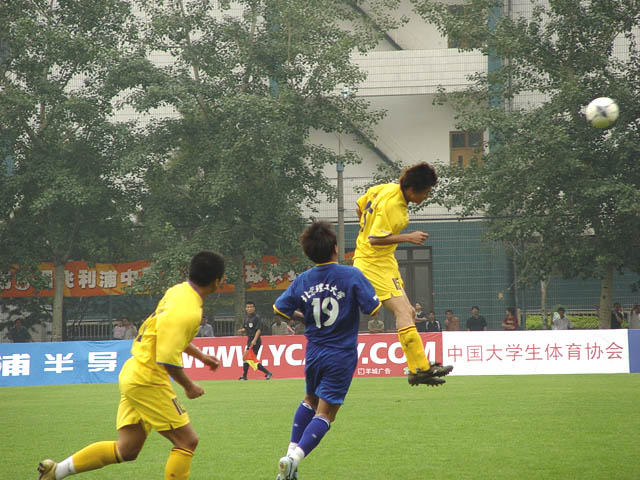 第五屆飛利浦中國大學(xué)生足球聯(lián)賽總決賽我校足球隊(duì)的首場比賽5日在中國人民大學(xué)上演。主場作戰(zhàn)的中國人民大學(xué)在下半場20分鐘時(shí)曾憑借一個(gè)點(diǎn)球領(lǐng)先了一刻鐘,但我校足球隊(duì)頑強(qiáng)拼搏,在下半場依靠第35分鐘7號(hào)李爽和40分鐘3號(hào)姚遠(yuǎn)的連續(xù)入球反敗為勝,取得了關(guān)鍵的首場比賽的勝利,目前小組積分名列第一。
