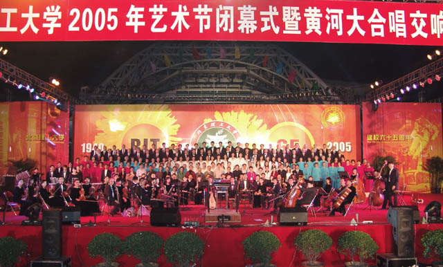 今年適逢抗日戰爭勝利60周年,作為藝術節的重要內容之一,黃河大合唱交響音樂會以紀念抗戰為主題,吸引了眾多師生參與。參加演出的有我校大學生交響樂團、合唱團、延河合唱團、教師合唱團等,氣勢恢宏,催人奮進。