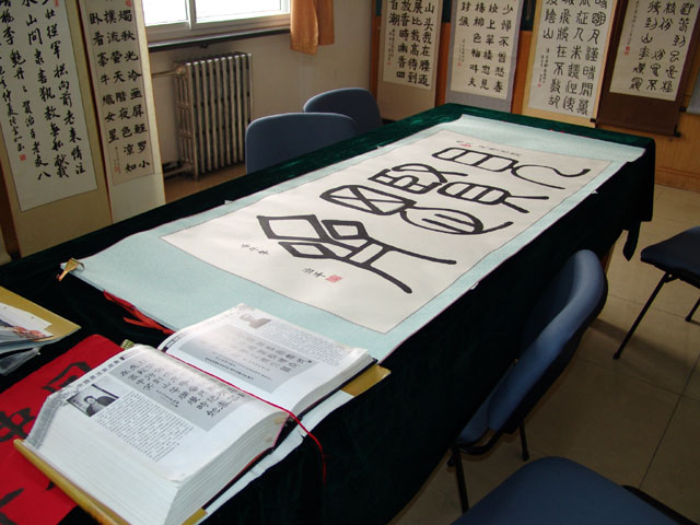 張治平先生在與參觀書法展的教師進行溝通交流。