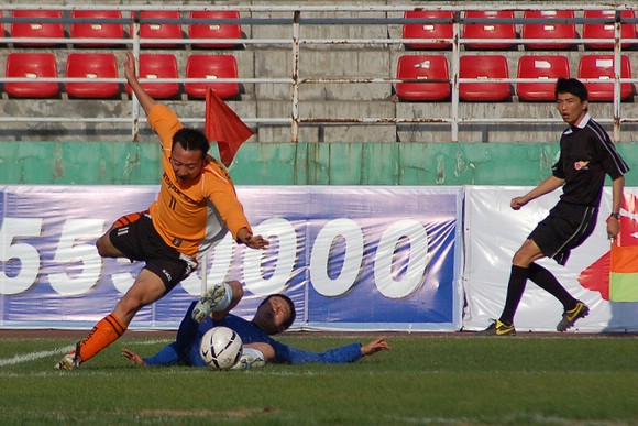 北京理工大學(xué)足球隊(duì)11號隊(duì)員王強(qiáng)帶球沉底突破進(jìn)入禁區(qū)前被對方鏟倒。
