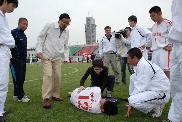 比賽結束之后,校長匡鏡明在興奮之余,親自來到賽場中間看望舍身堵“槍眼”的劉猛同學,經過簡單治療,劉猛幸無大礙。