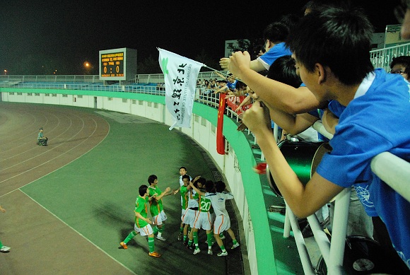 在6月7日客場與排名墊底的北京宏登的客場比賽中,北京愛國者大學生足球隊無論是球迷數量和場上局面都“反客為主”,最終以1:0拿下了這場非常關鍵的保級大戰,排名也由之前的第十二位上升至第九位,并領先北京宏登隊7分,暫時脫離了降級區。