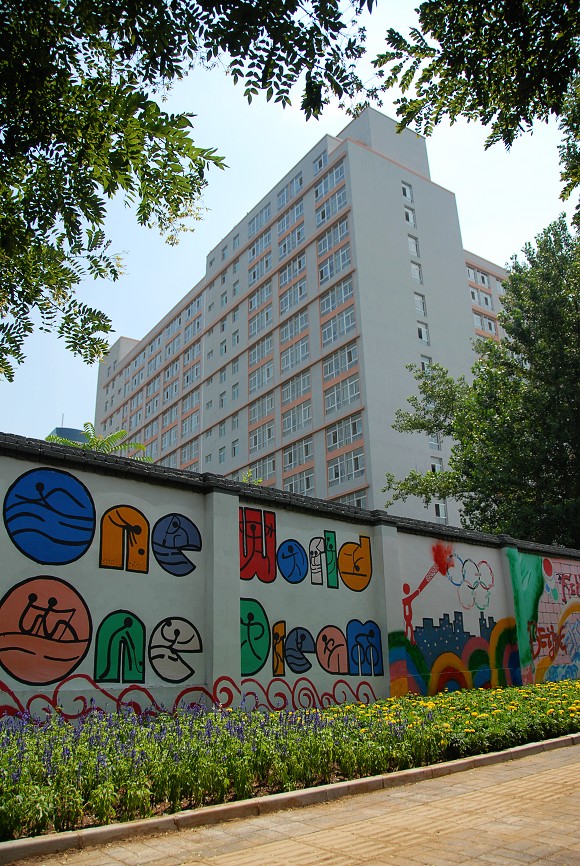 內(nèi)容豐富、創(chuàng)意十足的奧運涂鴉與整潔的校園建筑交相輝映。