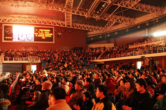 在回顧了歷次新年音樂(lè)會(huì)的精彩花絮之后,2009年新年音樂(lè)會(huì)正式拉開(kāi)了帷幕。由校大學(xué)生藝術(shù)團(tuán)交響樂(lè)團(tuán)帶來(lái)的一曲節(jié)奏歡快的《北京喜訊到邊寨》,在體育館中營(yíng)造了喜慶熱烈的新年氛圍。