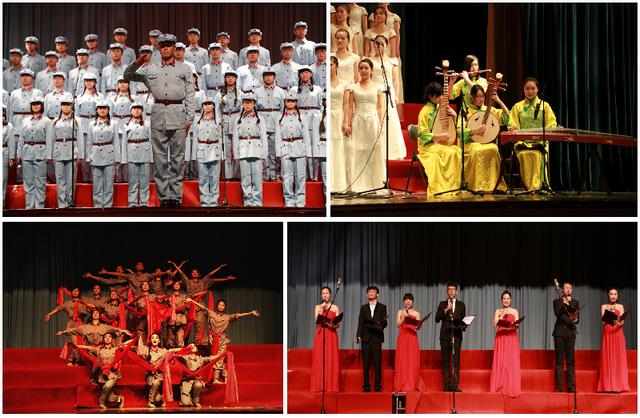 歌詠比賽在表演唱《紅梅贊》中拉開帷幕。在“我愛你中國”、“救亡與解放”、“追尋中國夢”三個(gè)篇章中,進(jìn)入決賽的12支隊(duì)伍相繼演唱了《唱支山歌給黨聽》、《歌唱祖國》等經(jīng)典愛國歌曲,各參賽隊(duì)以聲情并茂的演唱,熱情飽滿的精神面貌,豐富多彩的舞臺(tái)造型以及富有新意的場景表演贏得了在場觀眾一陣陣熱烈的掌聲,同時(shí)也贏得了到場評委的一致好評。篇章之間,我校大學(xué)生藝術(shù)團(tuán)還表演了紀(jì)念毛澤東同志誕辰120周年的原創(chuàng)舞蹈《東方紅》及詩朗誦《追夢青春》。