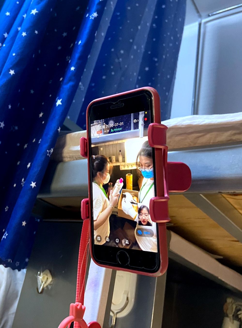 在北京理工大學(xué)一間女生宿舍里,設(shè)計與藝術(shù)學(xué)院的老師朱彥蒙,正對著手機與屏幕中的一位同學(xué)交流。手機用自拍桿架在宿舍床邊,視頻中的女孩是該學(xué)院畢業(yè)生孫嘉,身在遼寧家中。