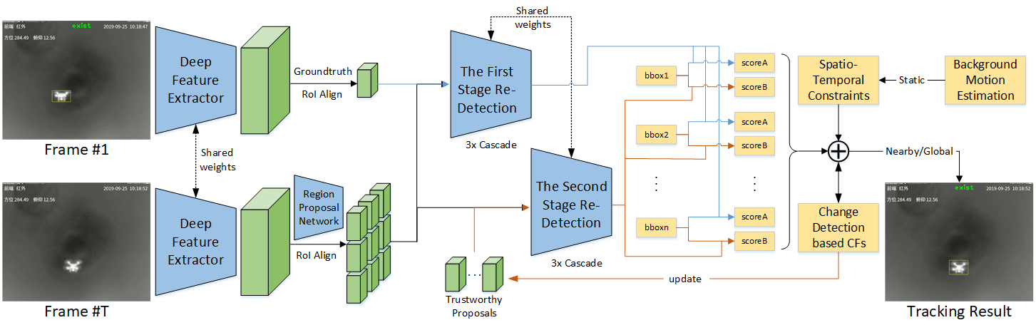 冠軍團隊針對紅外無人機目標尺度小、對比度低、易受背景干擾等難題,提出的新型SiamSTA跟蹤器。SiamSTA充分挖掘紅外視頻序列中的時空信息和目標運動特征,設計了局部跟蹤和全局檢測的自適應動態目標搜索機制:當目標狀態可靠時采用局部跟蹤,利用視頻時空連續性,有效抑制背景干擾;當目標狀態不可靠時(發生完全遮擋、從視野消失等)采用全局檢測,結合目標運動特征鎖定候選區域,提高目標再捕獲概率。