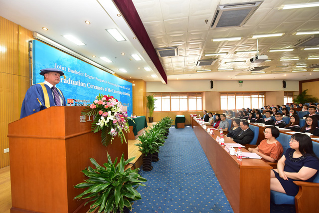Roger Gibbard教授發表致辭。他首先高度肯定了本項目畢業生所獲得的優異成績,并希望同學們在大學里結下的友誼長存。他回顧了本項目發展壯大的歷程,這凝聚了雙方院校的辛勤汗水,對北京理工大學的支持與合作表示衷心的感謝!他希望同學們從中西結合的教育體系下成長,能夠更加適應當今世界全球化的進程。他叮囑同學們離開校園步入新的人生階段之后,要努力做一個充滿正能量的人,積極樂觀、不要消極;要學會看見機會,而不是問題;學會享受過程,學以致用。