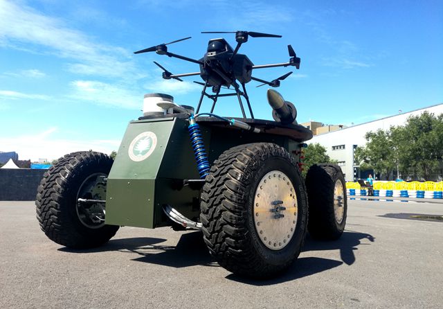 此次在世界機器人大會上亮相的是“地面航母”第二代樣機。在第一代樣機的基礎上,“地面航母”第二代樣機上方云臺還搭載了由北理工研發的“飛天工兵”空中自主作業機器人、合作單位研發的武裝無人機和107毫米巡飛彈。其中,空中自主作業機器人著眼于作業任務對復雜環境適應性和作業系統智能性的要求,創造性地將工兵快速遂行多種工程作業與戰斗任務的能力拓展到空域之中,特別適用于軍、警、民各領域中的接觸型自主作業任務;所搭載的武裝六旋翼無人機具有偵察、救援、武裝攻擊、察打一體等功能,可自主巡航60-90分鐘,實現500米范圍內的爆震彈、催淚彈精準發射;所搭載的107毫米巡飛彈可采用炮管發射方式固定翼無人機,固定翼無人機的巡航高度可達到數公里,進行較長時間的自主巡邏飛行,完成偵查、毀傷評估、目標打擊等任務。