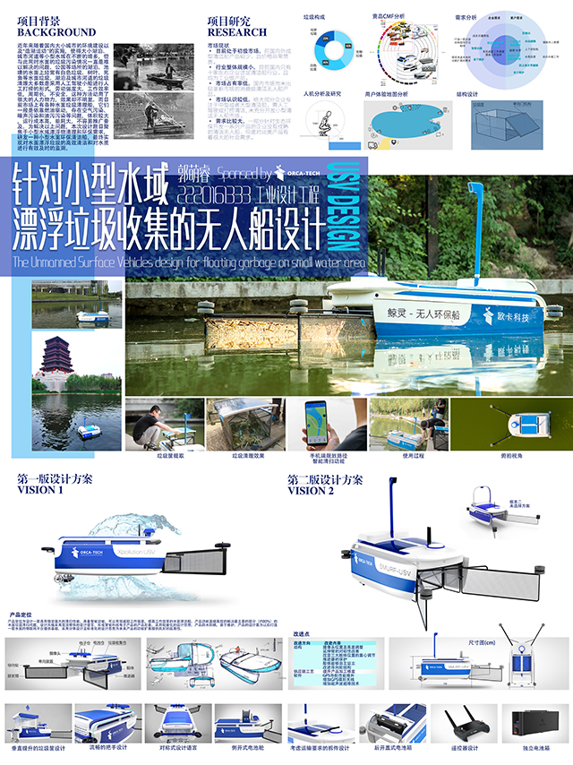 設計說明:產品定位為設計一款具有未定強大的清掃性能,具備智能功能,可以有效減輕工作強度,提高工作效率的水面清潔船。產品功能直接高效的解決最主要的部分(約80%)的水面垃圾清掃問題。設計風格采用簡潔明快的設計語言,形成智能科技電子產品的產品形象。采用輕量化的設計思想,產品防水防曬,易于維護,易于維修。產品的設計腰圍以后打造一款水面的物聯網平臺提供基礎,采用分體設計及標準化的設計思想為未來產品的功能拓展提供良好的延展性。