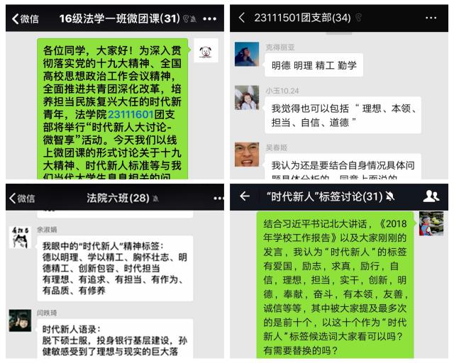 為深入貫徹落實黨的十九大精神、全國高校思想政治工作會議精神,全面推進共青團深化改革,團結帶領廣大團員青年聽黨話、跟黨走,培養擔當民族復興大任的時代新人,法學院于2018年6月,在全院范圍內組織各團支部廣泛開展了“時代新人大討論”微智享活動。