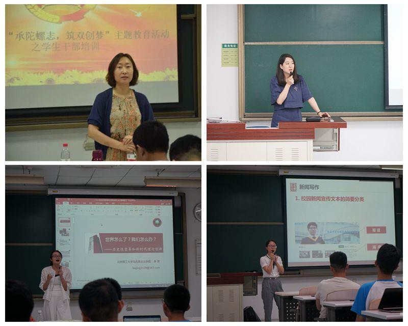 馬克思學(xué)院教師李京講授了“世界怎么了?我們怎么辦?——?dú)v史性變革和新時(shí)代理論創(chuàng)新”,從全球視野的角度,向全體參訓(xùn)學(xué)生解析了習(xí)近平新時(shí)代中國特色社會主義思想。她指出,作為新時(shí)代新青年,當(dāng)代大學(xué)生應(yīng)該不斷學(xué)習(xí)、獨(dú)立思考、自主選擇、鍛造逆商,承擔(dān)應(yīng)有的歷史擔(dān)當(dāng)。自動(dòng)化學(xué)院輔導(dǎo)員金林劍、向玉蘭指導(dǎo)參訓(xùn)學(xué)生集體學(xué)習(xí)了習(xí)近平總書記同團(tuán)中央新一屆領(lǐng)導(dǎo)班子成員集體講話精神、《不辱時(shí)代使命,不負(fù)人民期望-習(xí)近平總書記對青年學(xué)子的寄語》《在新時(shí)代征程中砥礪前行》共青團(tuán)改革綜述等內(nèi)容。物理學(xué)院副書記副院長王晶晶講授了學(xué)生心理健康的專題講座,她運(yùn)用薩提亞冰山模型,教育學(xué)生正確認(rèn)識自我,并關(guān)注大學(xué)生心理健康教育。黨委宣傳部韓姍杉作題為《做好校園新聞報(bào)道的三把鑰匙》的授課,從新聞寫作、新聞攝影和新媒體運(yùn)營三個(gè)方面,為學(xué)生干部講授了新媒體運(yùn)營的工作技巧和注意事項(xiàng)。機(jī)電學(xué)院團(tuán)委書記于滿作“樹立服務(wù)意識,培養(yǎng)大局觀念”的講座,她強(qiáng)調(diào),學(xué)生干部要“三思而后行”,有自己的思考,不能人云亦云,也分享了與老師同學(xué)溝通的技巧,從禮儀規(guī)范、氣質(zhì)胸懷和文化品位等方面教導(dǎo)學(xué)生干部提升個(gè)人素質(zhì),做一個(gè)好干部。