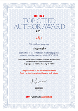 日前,材料學院曹茂盛教授收到英國皇家物理學會(IOP)發來的賀信,其指導的博士生盧明明和王希晰以共同第一作者身份發表在Nanotechnology(2016, 27, 065702)的文章“Carbon nanotube-CdS core–shell nanowires with tunable and high-efficiency microwave absorption at elevated temperature”入選“2018年英國皇家物理學會(IOP)高被引作者獎 (中國)”,IOP出版集團向獲獎論文通訊作者和兩位共同第一作者頒發了榮譽證書,這是英國皇家物理學會(IOP)首次授予中國科技工作者此項榮譽。