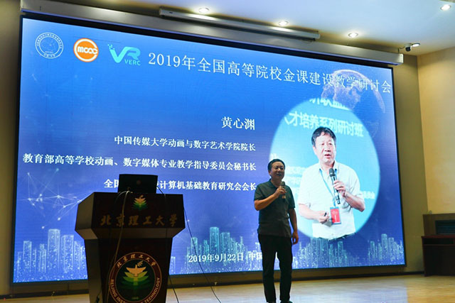 中國傳媒大學動畫與數字藝術學院院長、教育部高等學校動畫數字媒體專業教學指導委員會秘書長、全國高等院校計算機基礎教育研究會會長黃心淵教授從金課建設的發展現狀以及聯盟和基礎教育研究會所做的工作方面,介紹了有益的參考意見,為大會研討提出了富有建設意義的研討主題。