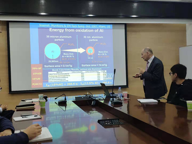 Vladimir E.Zarko教授在報告中介紹了納米含能材料和聚氮化合物的發展歷史,分析了各個國家的研究者對納米含能材料和聚氮化合物發展所作出的貢獻,探討了含能材料未來的發展方向。Vladimir E.Zarko教授的報告圖文并茂,深入淺出,給在場師生帶來了一場頂級的學術盛宴。報告結束后,Vladi mir E.Zarko教授與在座的師生們就含能材料的發展問題進行了熱烈討論。