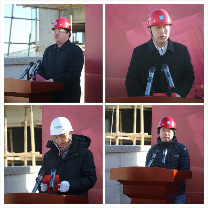 后勤基建處處長黨華主持結構封頂儀式,簡要介紹了工程有關情況。施工單位、監理單位、設計單位代表先后致辭。