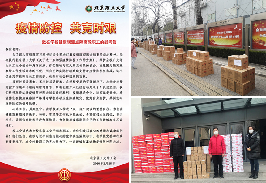 在疫情肆虐、武漢告急的重要時刻,2月2日,在校工會的倡議下,各基層工會積極響應,組織本單位教職工通過北京市溫暖基金會“溫暖武漢”項目進行網上捐贈。廣大教職工積極響應,踴躍捐贈,部分二級工會的捐贈率達到了100%。2月28日、3月25日,校工會領導兩次來到學校疫情防控健康觀測點,看望慰問一線工作人員和在此隔離觀察的100余位教職工,為他們送去牛奶、水果、方便面等物品。此外,校工會還為工作在疫情防控一線的醫務、安保人員等單獨撥付了防控補助1.5萬元。