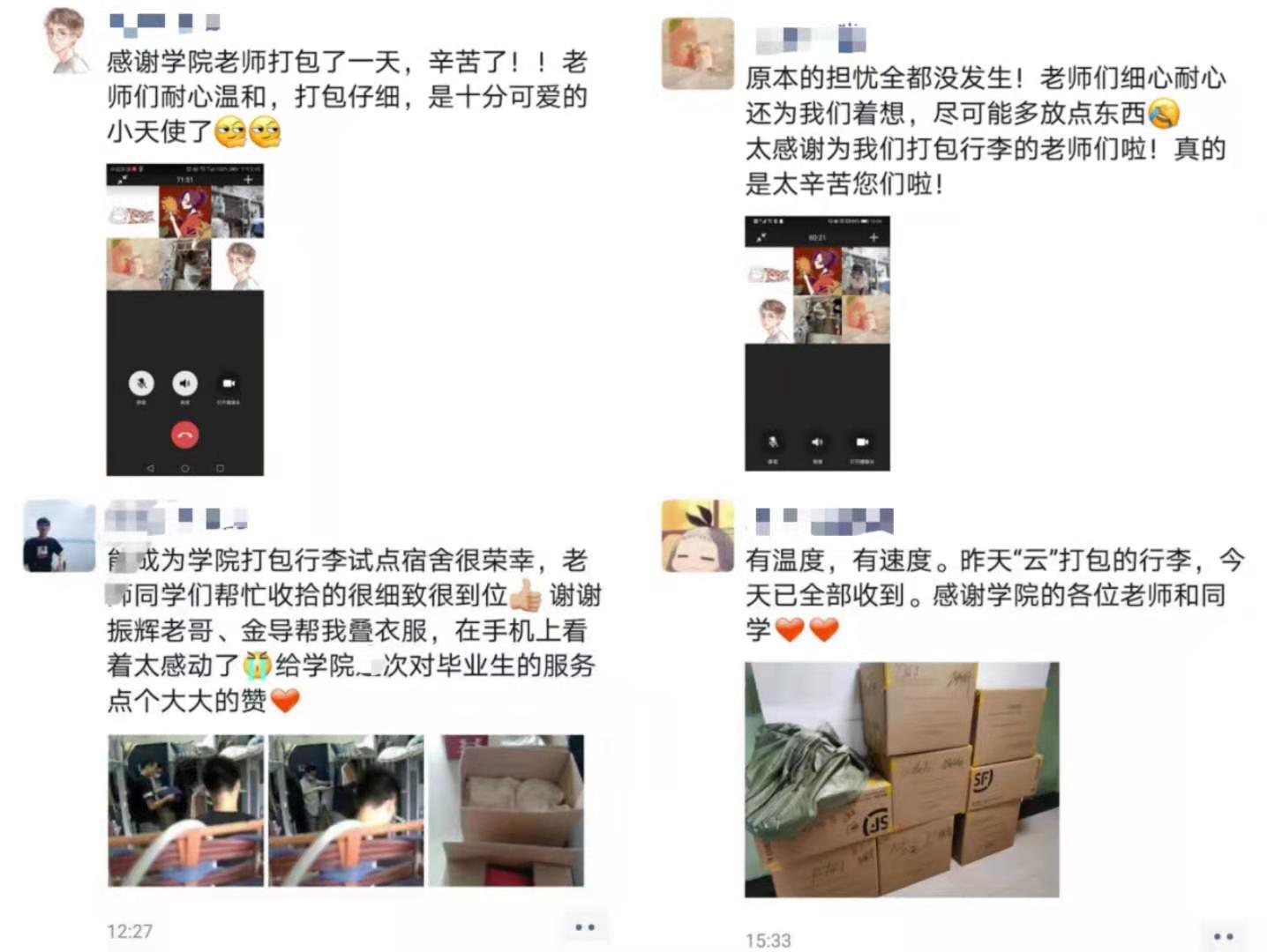 “云打包”中的感人畫面讓畢業生們發出感嘆:“老師們耐心溫和,打包仔細,是十分可愛的小天使了”;“原本的擔憂全都沒發生!老師們細心耐心還為我們著想,盡可能多放點東西”;“有溫度,有速度。昨天打包的行李今天就全部收到啦”……畢業生們的真情流露傳遞著溫暖,更傳遞了對母校和母院的愛。