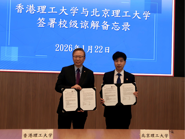 香港理工大學是學校在港重要戰(zhàn)略合作伙伴,雙方合作已逾20年。姜瀾與校長滕錦光舉行會談并達成共識,將進一步對接大灣區(qū)戰(zhàn)略,探索共建未來技術學院,推進博士雙學位、本研貫通培養(yǎng)項目,推動兩校合作走深走實。雙方校長續(xù)簽校級諒解備忘錄,見證簽署北理工醫(yī)學技術學院與港理工生物醫(yī)學工程學系合作協(xié)議,交換共建京港智慧綠色經(jīng)濟聯(lián)合實驗室、經(jīng)濟監(jiān)督大模型實驗室、智能電子大灣區(qū)聯(lián)合實驗室3份合作意向書。