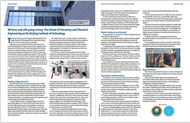11月22日,《Science》在其Advertorials欄目專題報道了北理工化學與化工學院發展建設,詳細介紹了學院的學科布局與發展、科學研究、國際化建設,并對2016年榮獲國家自然科學二等獎的楊國昱教授團隊、2018年榮獲國家技術發明二等獎的孫克寧教授團隊,以及他們分別所聚焦的多金屬氧簇研究、能源轉換和綠色化學研究等進行了重點報道。此外,文章稱,化學與化工學院將在已有的平臺建設、師資隊伍建設以及人才培養基礎上,進一步與學校的“雙一流”建設相結合,加強化學與化工兩個學科的融合發展,利用省部級國際交流平臺提升學科的國際化建設水平。