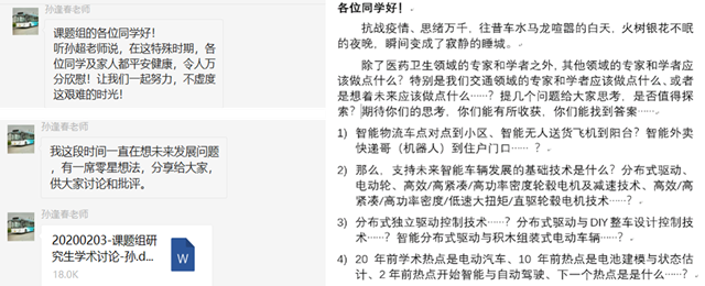 電動(dòng)車(chē)輛國(guó)家工程實(shí)驗(yàn)室的老師們深知學(xué)生們的困惑,第一時(shí)間就組織對(duì)所有學(xué)生本人和家長(zhǎng)進(jìn)行新冠肺炎情況摸底調(diào)查。深夜之中,老師們還在思考學(xué)生們的研究課題,為學(xué)生提供創(chuàng)新的想法;肺炎肆虐,老師們決心從本學(xué)科專(zhuān)業(yè)出發(fā),為防控疫情提供科技支撐;放眼未來(lái),老師們堅(jiān)信我們一定可以打贏這場(chǎng)硬仗,而現(xiàn)在必須思考未來(lái)的發(fā)展方向。同學(xué)們深受鼓舞,縱使心生膽怯,看到老師的鼓勵(lì)也會(huì)學(xué)會(huì)勇敢。每一次討論都積極踴躍,同學(xué)們的反饋既振奮又有趣:“謝謝老師的指導(dǎo),我認(rèn)為自動(dòng)化的物流配送一定會(huì)是未來(lái)!”,“在家里憋壞了,和老師同學(xué)們一起探討問(wèn)題才找回了信心!”……疫情當(dāng)前,北理師生勇?lián)厝危蛹腋綦x戰(zhàn)病毒,“閉門(mén)造車(chē)”創(chuàng)一流!