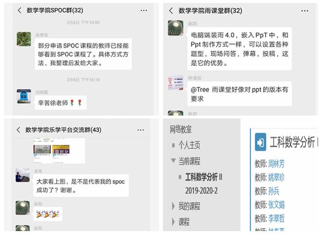 分別建立“樂學”“SPOC”“雨課堂”的技術支持群,分類指導,精準實施;《高等數學》《高等代數》《概率與數理統計》等公共基礎課充分發揮各自教學組的作用,教師們主動學習、互相合作,堅持“務必想在學生前面”的理念,不斷測試、調整、完善;北京市青年教學名師徐厚寶主動整理撰寫了“教師發布SPOC課程說明”資料,方便其他教師盡快掌握平臺的運行操作;《工科數學分析》的任課教師閆曉霞通過編寫“課程學習筆記”,幫助學生明確每周的學習目標、學習內容及方式、作業及要求,確保學生在線學習質量有保障。截止目前,學院承擔的全校所有數學公共課程均已完成網絡課程建設工作,保證延期開學期間相關教學工作有序開展。