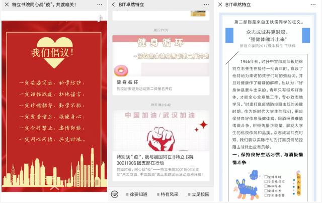 學院啟動“眾志成城 共克時艱—特立學子在行動”網絡主題教育,發布同心戰疫“六個一定”倡議書,并依托學院公眾號“BIT卓然特立”、各年級QQ群等網絡平臺開展一系列防疫相關活動。在思想引領方面,組織全體學生在線集體學習“開學第一課”,分團委組織23個團支部共同開展“同心戰疫”線上主題團日活動,引領全體團員青年安居簡出、科學防護,理性戰疫、杜絕謠言,珍惜韶華、勤學不輟,愛勞重衛、強健身心,令行禁止、要情即報,同心戰疫、共克時艱,模范落實“不返京、不返校、不離家、不流動”要求,攜手打贏疫情防控的人民戰爭總體戰阻擊戰。