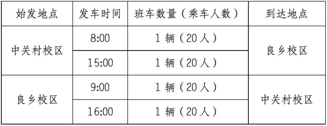 中關村校區與良鄉校區之間班車自2020年2月18日起按照每天兩趟運行,具體發車時間如下: