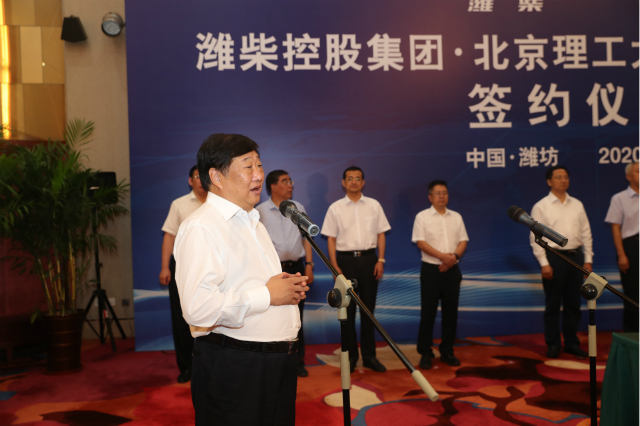 8月24日,北京理工大學與濰柴控股集團有限公司(以下簡稱濰柴集團)簽署戰略合作協議。山東省副省長凌文,濰坊市委書記惠新安,濰柴集團董事長譚旭光,黨委書記、常務副總經理徐宏,北京理工大學校長張軍、副校長王博、校長助理李振鍵出席簽約儀式。簽約儀式由徐宏主持。