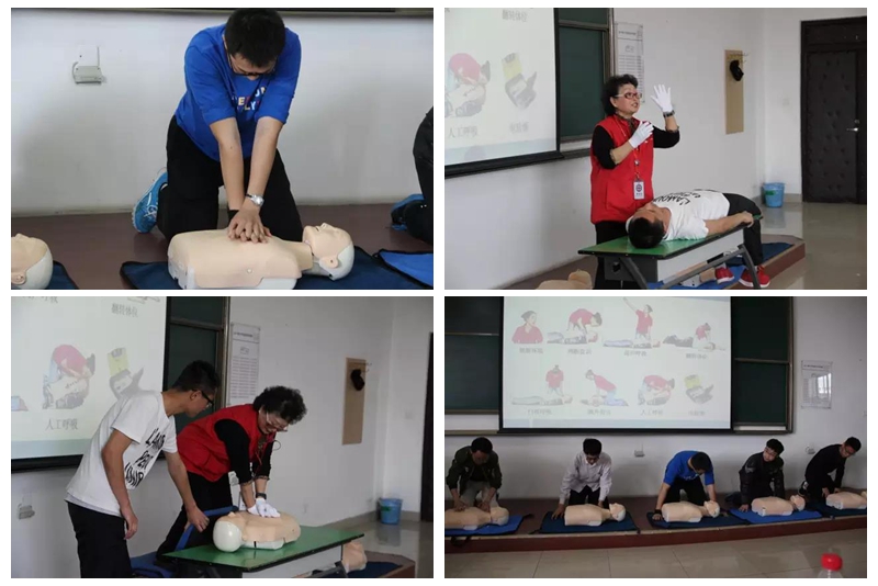 最后,嬴老師為我們講解了心肺復蘇術,這是本次講座最重要的部分,嬴老師特地為我們借來了人體模具,以此來加深我們對心肺復蘇方法的了解。 嬴老師在臺下挑選了一位志愿者來具體示范心肺復蘇的流程以及掌根按壓的位置,隨后,嬴老師又在人體模具上進行了示范。方法講解完畢后,嬴老師便邀請志愿者們登上講臺去親自感受心肺復蘇術,志愿者們積極踴躍,紛紛上臺去進行練習。
