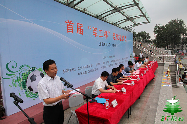 開幕式上,樓宇光為比賽致開幕詞,他代表工信部直屬機關黨委對本次比賽的舉辦表示祝賀。感謝北理工在為國家工業化、信息化、兩化深度融合,以及國防現代化做出卓越貢獻的同時,還能夠積極發揮學校在足球運動方面的優勢與特色,籌辦本次“軍工杯”足球賽,為軍工系統各單位通過足球運動加強交流,強健體魄,建設優秀組織文化搭建了良好平臺,符合當下國家振興足球、提高人民群眾身體素質的指導思想。2015年是紀念抗戰勝利70周年,誕生在抗戰烽火中的北理工也將迎來75周年華誕,因此我們全體參賽的軍工人也是通過比賽的形式弘揚軍工文化,矢志建設國防的奉獻精神,共同慶祝北理工建校75周年。希望北理工全體教職員工凝心聚力,深化改革,為早日建成世界一流理工大學不斷努力奮斗。