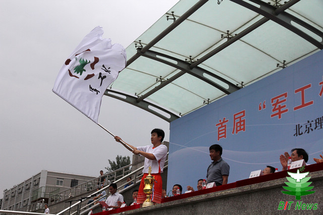 王承文為來自北理工的“軍工杯”足球運動員代表授予“軍工杯”足球賽旗幟。